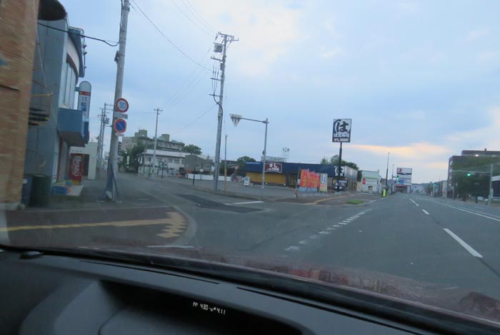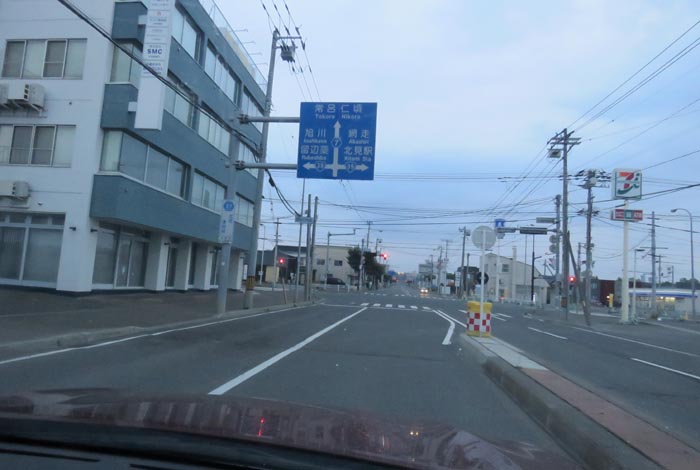 南岸通り、野付牛自動車学校前、前方はとん田通りの交差点