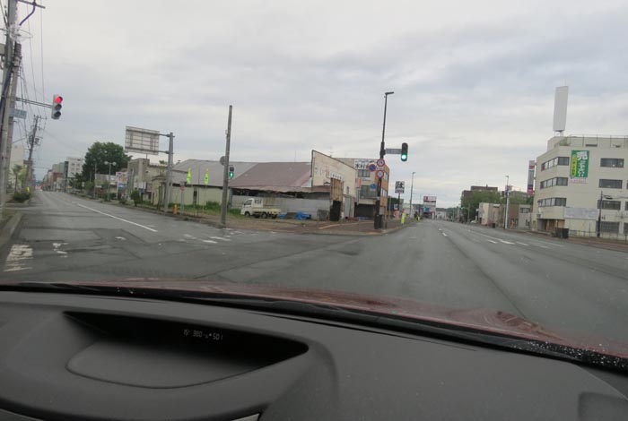 南岸通り、野付牛自動車学校前、前方はとん田通りの交差点