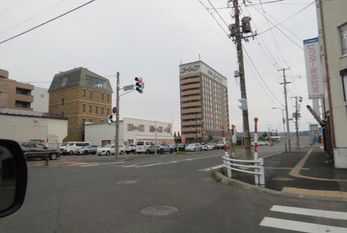 写真奥が五差路、写真右は北見市民会館側