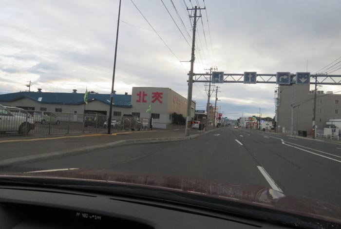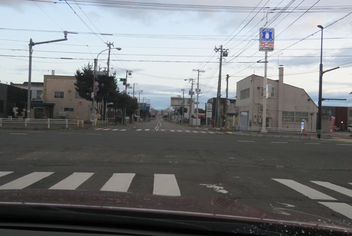 南岸通り、野付牛自動車学校前、前方はとん田通りの交差点