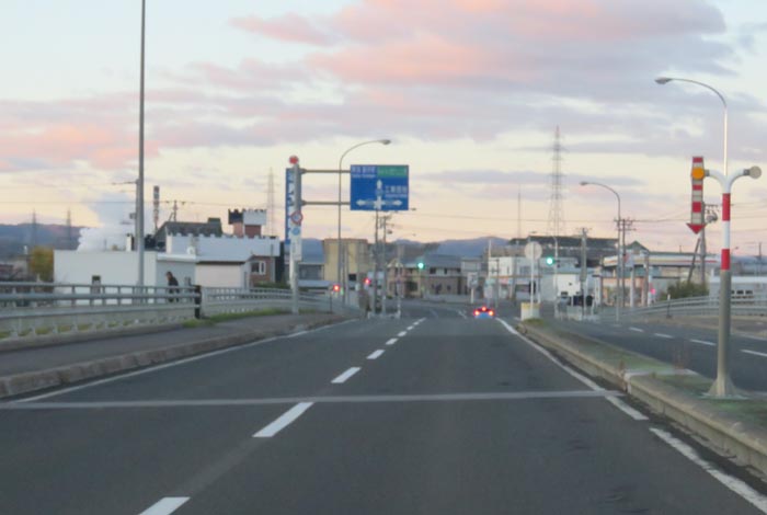 とん田通り、無加川橋を渡り錦町の南岸通り交差点