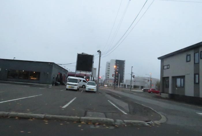 写真奥が五差路、写真右は北見市民会館側