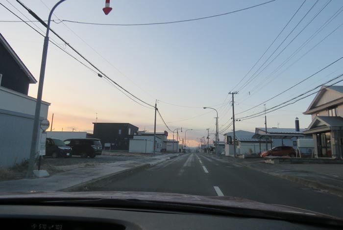 産岸通りから左折して西5号線のバス停前から北光通り交差点方向