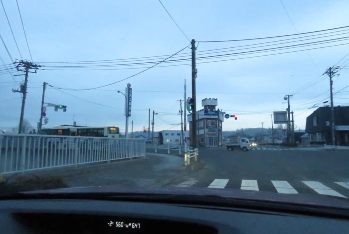 南岸通り、野付牛自動車学校前、前方はとん田通りの交差点