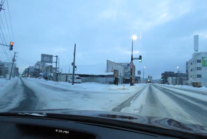 南岸通り、野付牛自動車学校前、前方はとん田通りの交差点