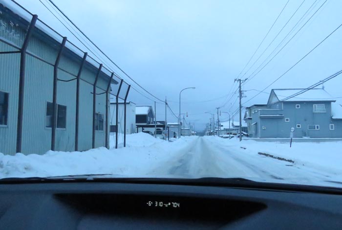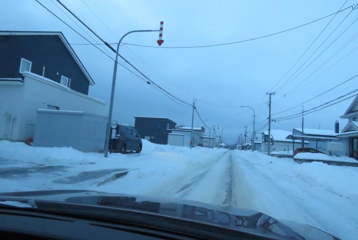 産岸通りから左折して西5号線のバス停前から北光通り交差点方向