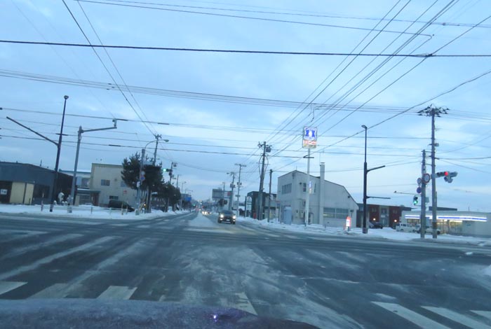 南岸通り、野付牛自動車学校前、前方はとん田通りの交差点