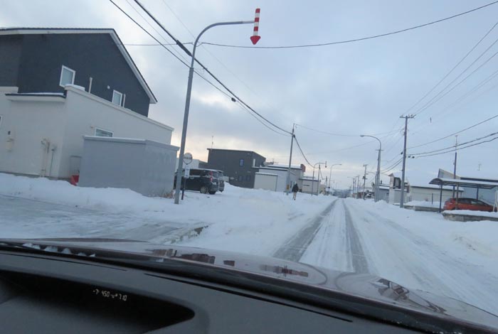 産岸通りから左折して西5号線のバス停前から北光通り交差点方向