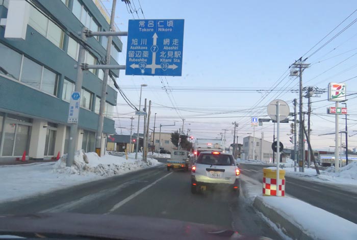 南岸通り、野付牛自動車学校前、前方はとん田通りの交差点