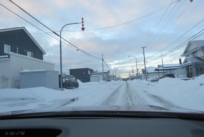 産岸通りから左折して西5号線のバス停前から北光通り交差点方向