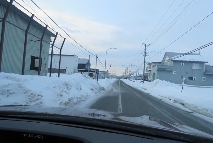 産岸通りから左折して西5号線のバス停前から北光通り交差点方向