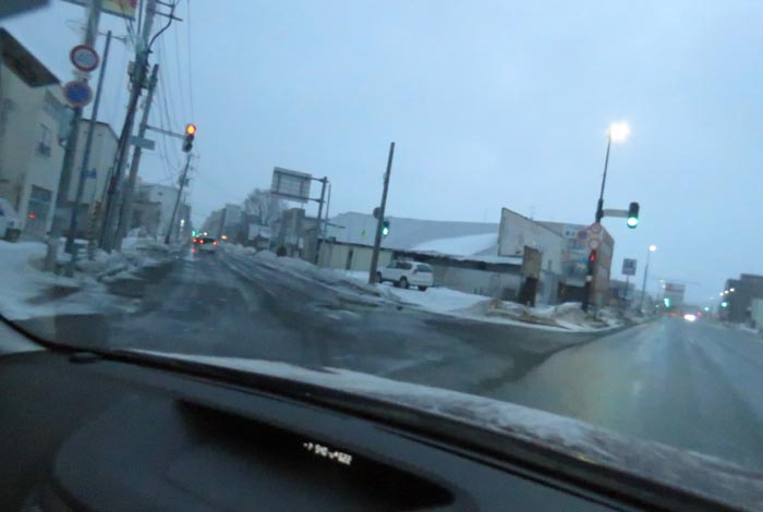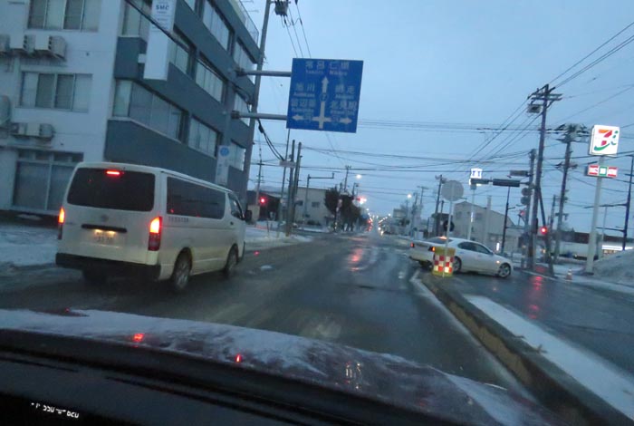 南岸通り、野付牛自動車学校前、前方はとん田通りの交差点