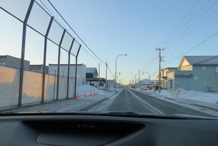 産岸通りから左折して西5号線のバス停前から北光通り交差点方向
