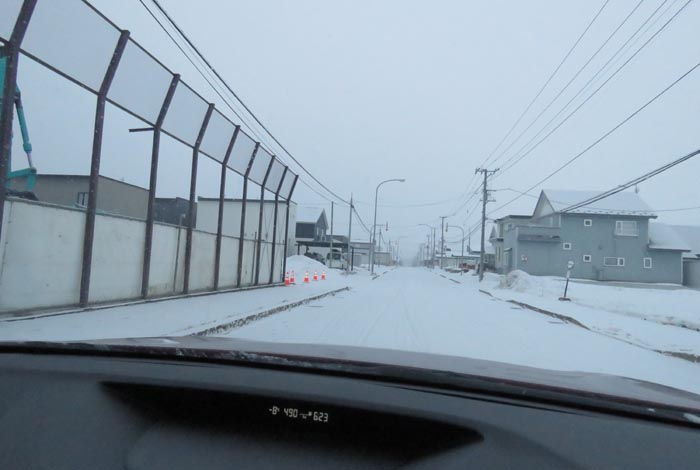 産岸通りから左折して西5号線のバス停前から北光通り交差点方向