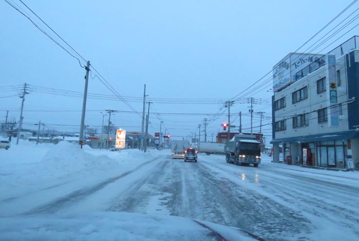 末広町の南岸通り、西4号線バス停前から野付牛自動車学校方向