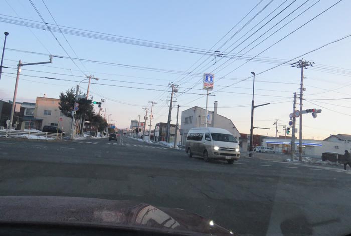 南岸通り、野付牛自動車学校前、前方はとん田通りの交差点
