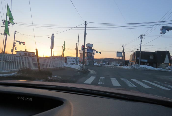 南岸通り、野付牛自動車学校前、前方はとん田通りの交差点