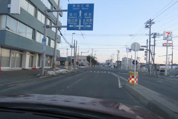 南岸通り、野付牛自動車学校前、前方はとん田通りの交差点