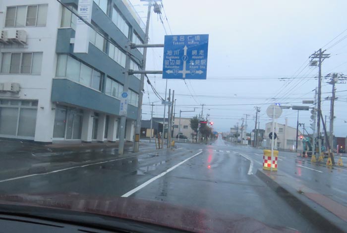 南岸通り、野付牛自動車学校前、前方はとん田通りの交差点