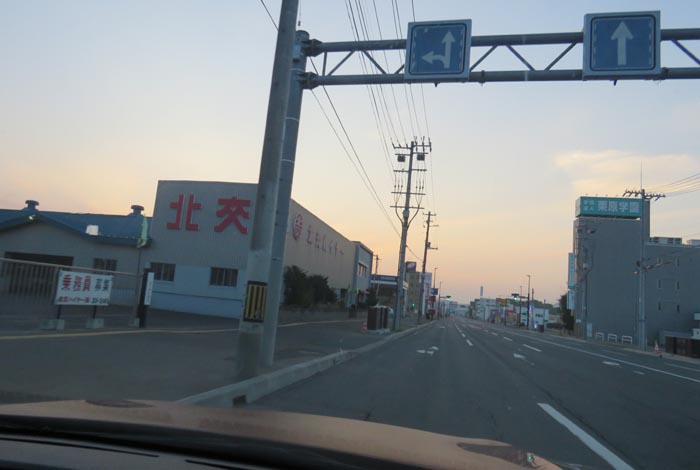 南岸通り、野付牛自動車学校前、前方はとん田通りの交差点