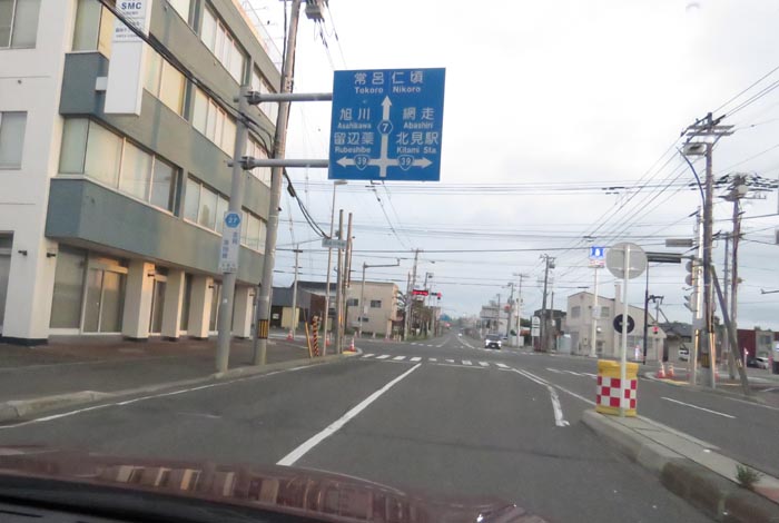 南岸通り、野付牛自動車学校前、前方はとん田通りの交差点