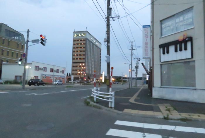 写真奥が五差路、写真右は北見市民会館側