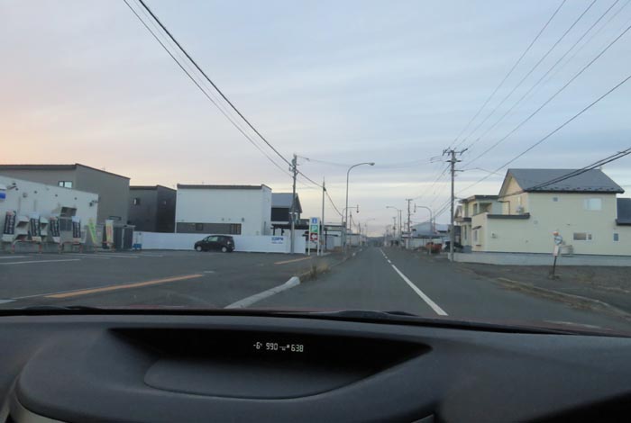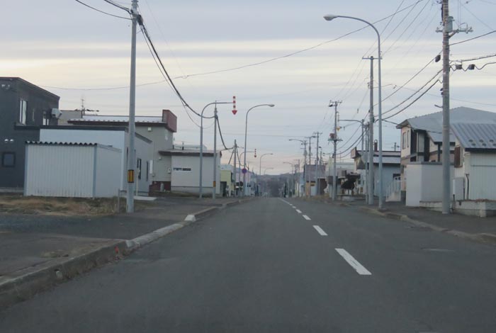 産岸通りから左折して西5号線のバス停前から北光通り交差点方向