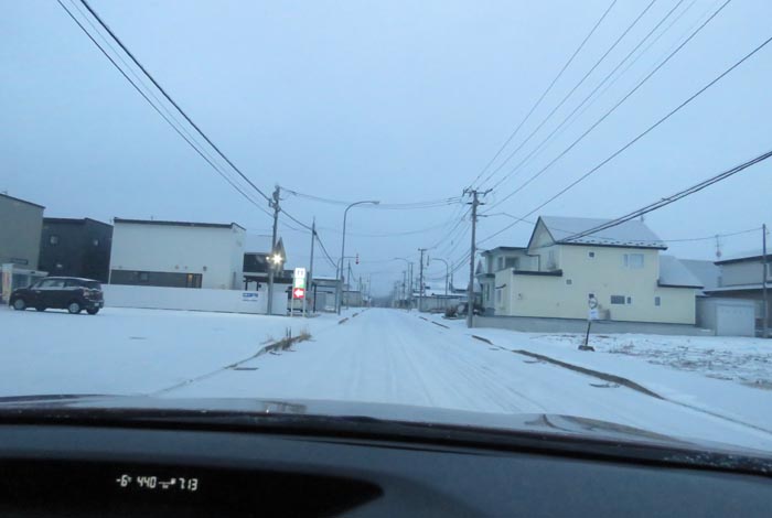 産岸通りから左折して西5号線のバス停前から北光通り交差点方向