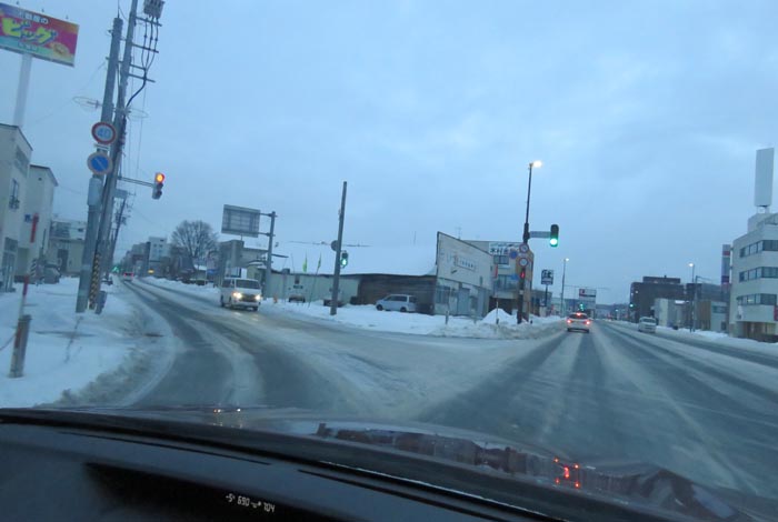 南岸通り、野付牛自動車学校前、前方はとん田通りの交差点
