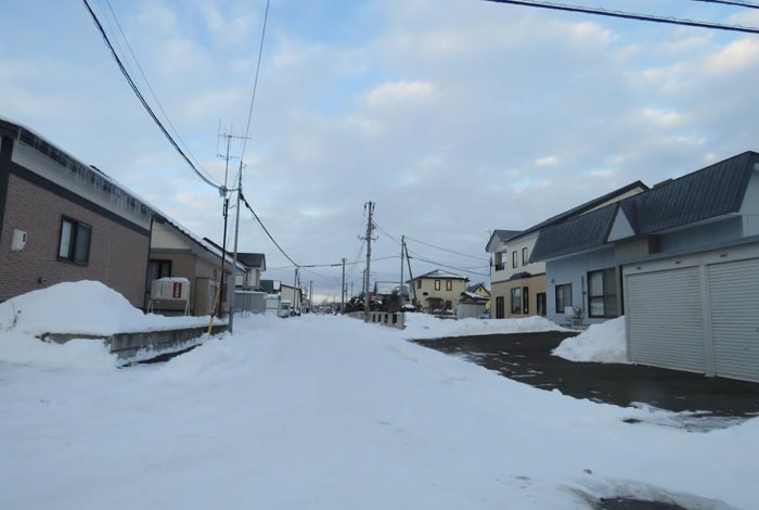 産岸通りから左折して西5号線のバス停前から北光通り交差点方向
