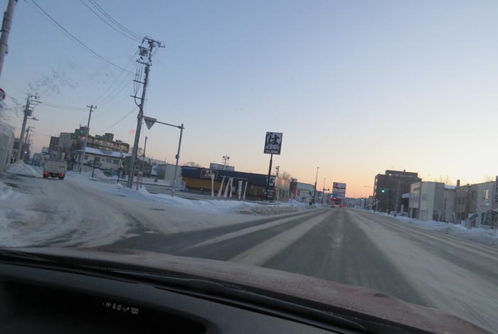末広町の南岸通り、西4号線バス停前から野付牛自動車学校方向