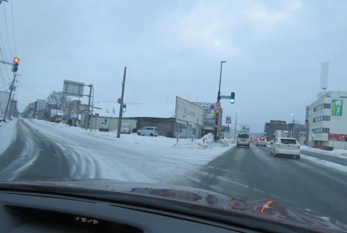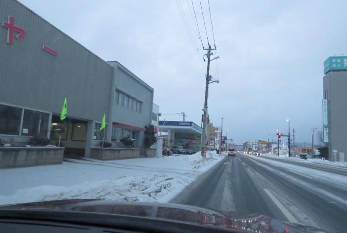 末広町の南岸通り、西4号線バス停前から野付牛自動車学校方向