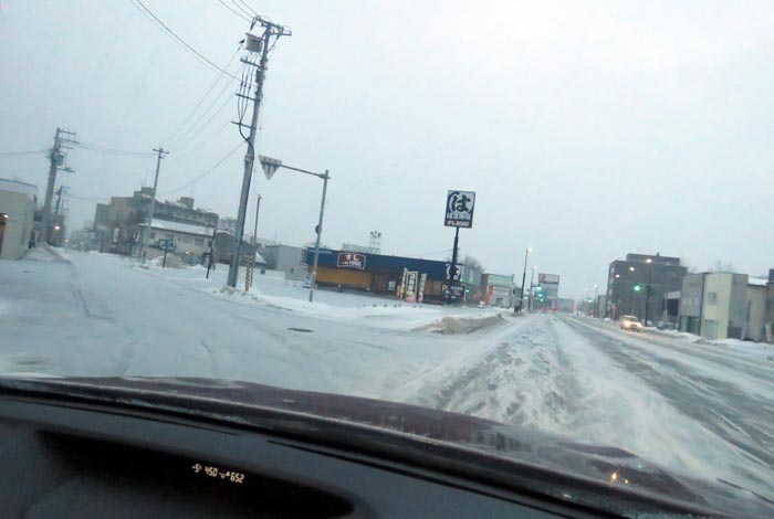 末広町の南岸通り、西4号線バス停前から野付牛自動車学校方向