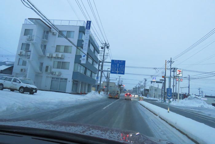 末広町の南岸通り、西4号線バス停前から野付牛自動車学校方向