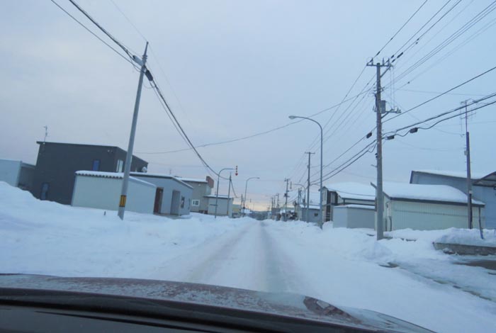 産岸通りから左折して西5号線のバス停前から北光通り交差点方向