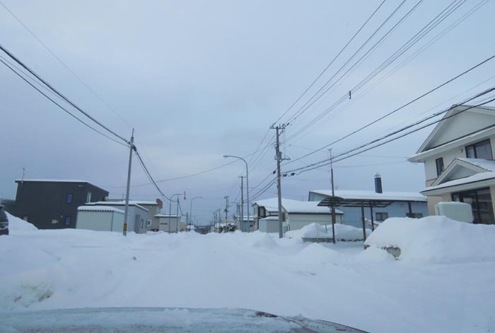 産岸通りから左折して西5号線のバス停前から北光通り交差点方向