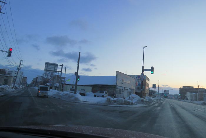南岸通り、野付牛自動車学校前、前方はとん田通りの交差点
