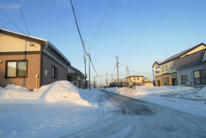 産岸通りから左折して西5号線のバス停前から北光通り交差点方向