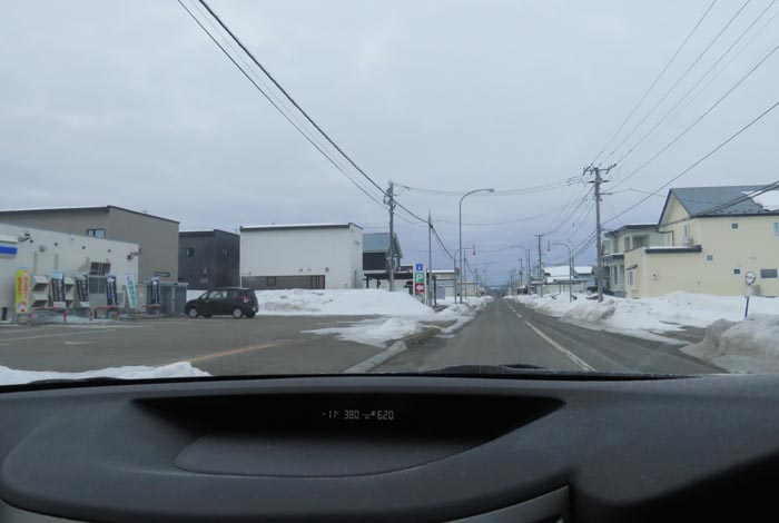 産岸通りから左折して西5号線のバス停前から北光通り交差点方向