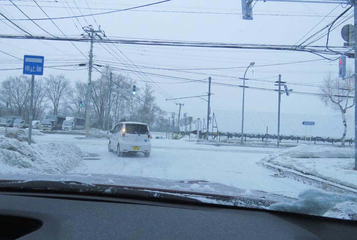 南岸通り、野付牛自動車学校前、前方はとん田通りの交差点