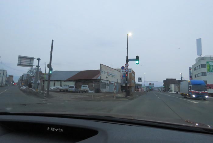 南岸通り、野付牛自動車学校前、前方はとん田通りの交差点