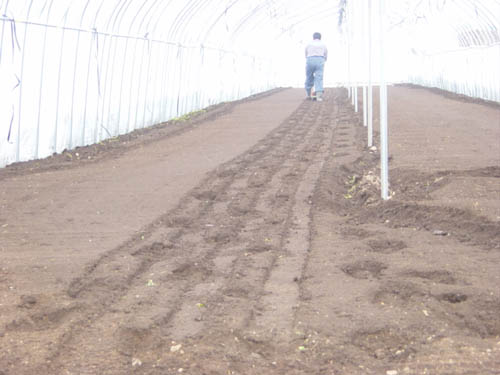 足跡の間の鎮圧すじにほうれん草の種が蒔いてあります。