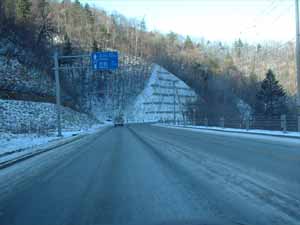 下り車線は日陰になっていてアイスバーン。