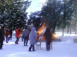 成人の日の今日、佐呂間神社では恒例のどんど焼きが行われ、たくさんの人がお正月飾りを持参して燃やし、今年の無病息災を願いました。