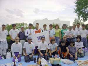 | サロマ湖ウルトラ100キロマラソンを明日に控え、受付会場の湧別町ではwebnewsの「サロマ湖100キロウルトラマラソンの掲示板」に集まっている全国のランナー達がオカジマデザイン“ほぼさろの旗”の元に集まり、にわかオフ会となりました。30人近くにもなったメンバー達は、シスオペ大口さんを囲んで楽しいひとときを過ごし、明日の健闘をたたえあっていました。 |