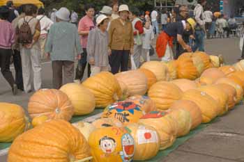 ![]() 重量コンテストに出品された巨大カボチャ「アトランティックジャイアント」。表面を彫り込んだり、ドラえもんなどの絵を描いた物もありました。 |