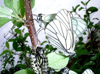 | この数日、毎朝起きるとうち庭で蝶の乱舞が見られる。姫リンゴの木にいっぱいの蝶々が舞うのである。 去年はこの姫リンゴ、満開の花が咲いた翌日に、突然すべての花が消え、どうしたのかと思いきや枝いっぱいに毛虫がついていたので全て取り払った。今年は花も咲かないでいたので放っておいたら見事にみんなさなぎになって毎朝蝶の誕生劇を催しているようだ。 まるで1本の木に白い花が咲いたような見事さである。 (うめこ) |