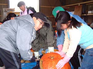 | 9月8日(土)道の駅「物産館みのり」脇の体験農場で、「ふるさと・わんぱく隊」の子どもたちによる、かぼちゃのくり抜き体験が行われました。当日はあいにくのお天気ではありましたが、それでも作業中は雨も降らず、みんなで楽しくくり抜きを行い、オリジナリティーあふれる作品が出来上がりました。完成した作品は道の駅「物産館みのり」に展示してあるので(10日間程度)、お時間のある方はぜひ足をお運びください。 (あべっち) |