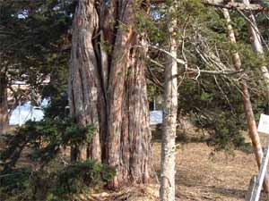 この神社は、太古より神の鎮座まします地であったのか、推定千年といわれる一対の雌雄のオンコの巨木があり、不思議にも、男の老木から若木が伸び老若一体となる。これぞ開運隆盛の兆しと部落民一同神木と称し敬神敬慕するにいたる。この思想を教育の基盤とし社殿兼用の児童教授所を建て大正二年六月一日に開校した。(案内看板より)
