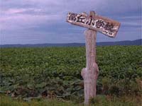 町道15号線の交差点にある学校の看板。夕日の写真は、ここからの眺め。